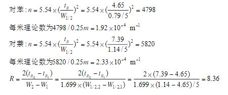 某YWG-C18H374.6mm×25cm柱,以甲醇-水(80:20)为流动相,记录纸速为5mm/min,测得苯和萘的tr和W1/2分别为4.65和7.39(min),0.79和1.14(mm)。求柱效和分离度。